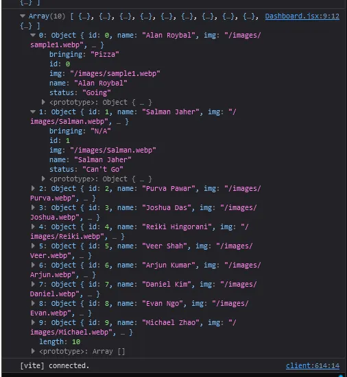 We changed our Card component to expect an object called props within its function parameters. We then destructured the props object with the dot ‘.’ operator into separate attributes such as props.img and props.name. We then rendered a new <Card /> component within our Dashboard.jsx file that specified the value of these attributes. Essentially we passed in an image, name, bringing, and status value for our Card component to utilize.