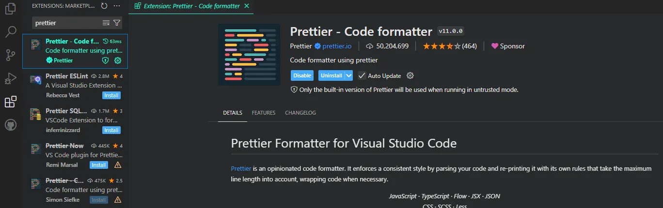 - In the search bar type in “prettier”
